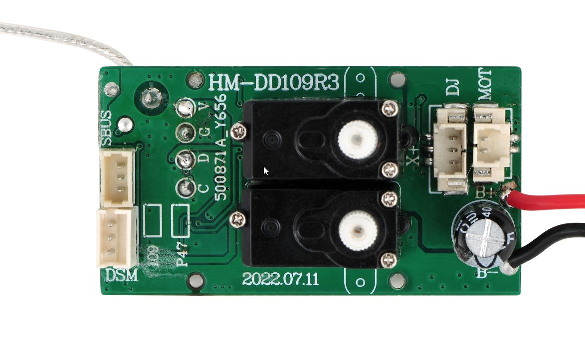 Das Hauptelektronik-Board der MDX PRO BF 109 ist mit einem 3-poligen DSMX- und einem S-Bus-Anschluss ausgestattet, was die Verwendung von optionalen externen DSMX-Satelliten oder S-Bus-Empfängern ermöglicht (siehe Bild).