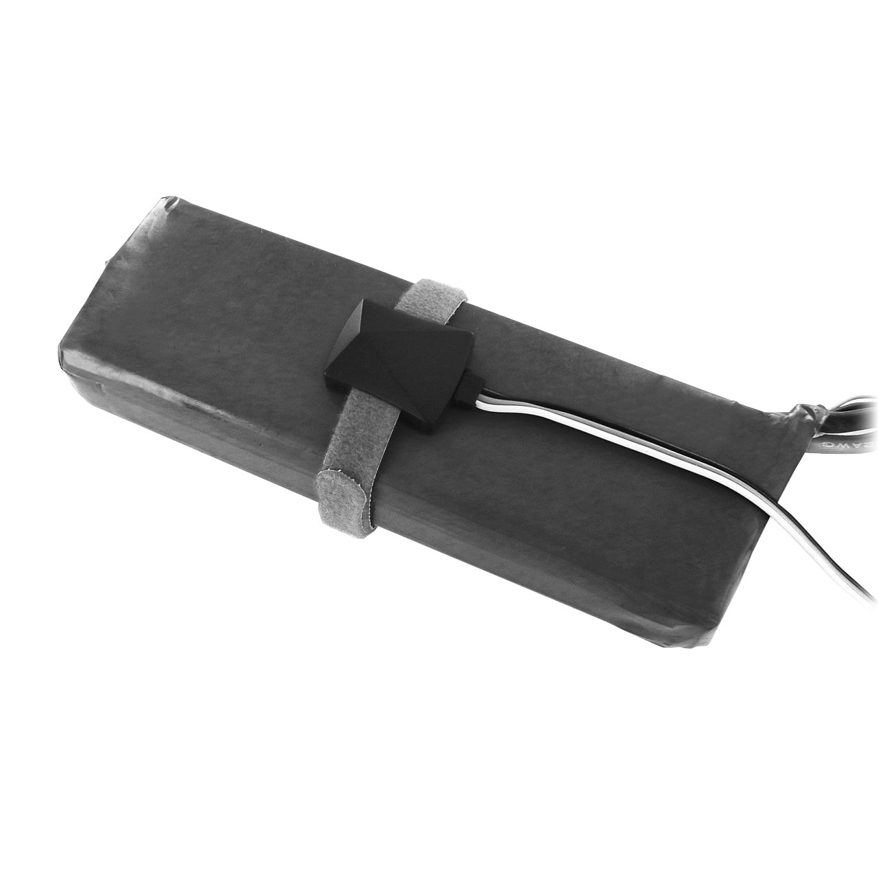 - Befestigen Sie den Sensor am Akku mit dem im Lieferumfang enthaltenen Klettband. Stellen Sie sicher, dass der Bereich unterhalb des Sensors frei von Schmutz und Ablagerungen ist. Wenn möglich, vermeiden Sie die Positionierung des Sensor über einem Aufkleber.