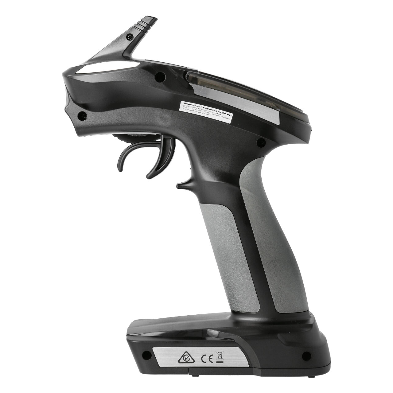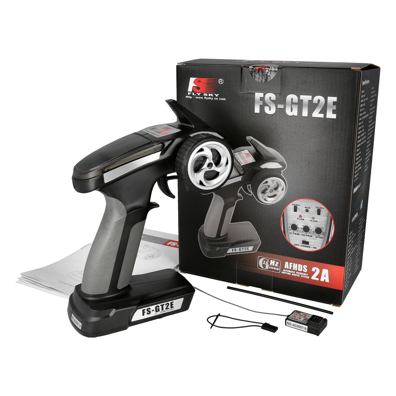 The FS-GT2E is a simple 2-channel 2.4GHz transmitter and it is ideal for getting started with controlling RC car models and boats. The transmitter runs on the AFHDS2A protocol and with this remote control, the antenna is installed externally. The transmitter can also be easily connected to the computer via the phone jack so that it can be used, for example, as a controller in games or simulation programs.*