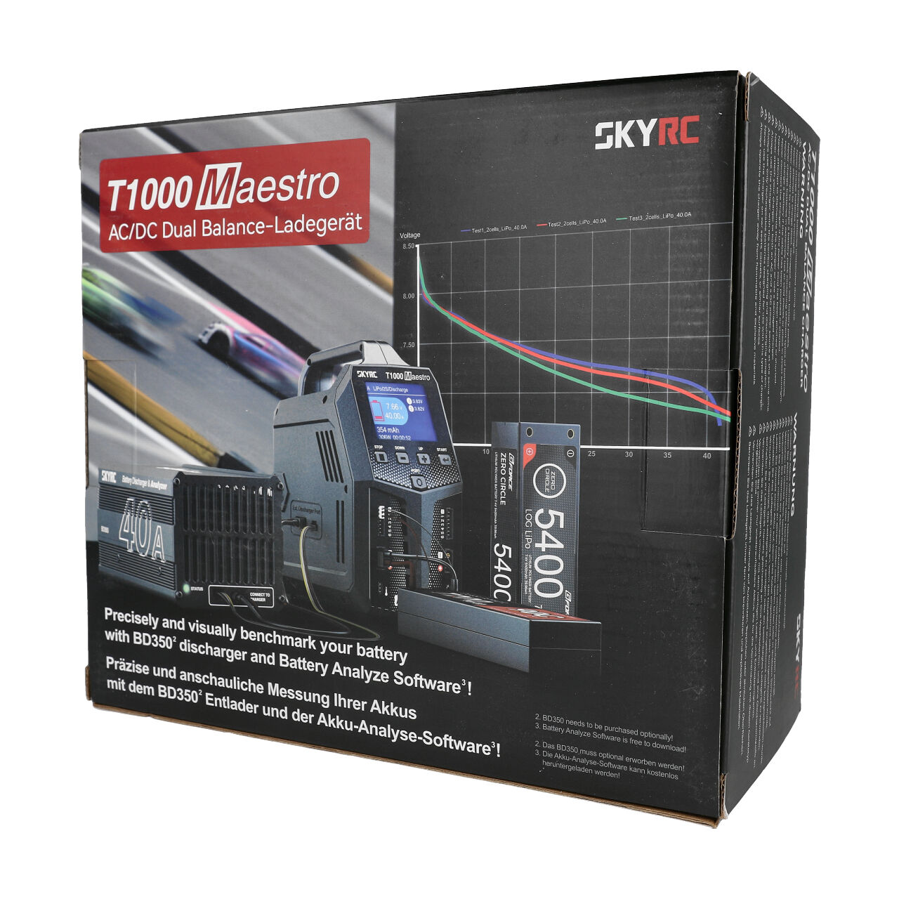 A powerful charging capacity and greatly increased speed make the dual charger T1000 from SkyRC a real highlight. Thanks to the built-in Arm Cortex-M4 chip with HyperBoost, batteries can be charged up to 20 times faster than e.g. via an iMAX B6. The slim, compact design together with the ergonomically shaped handle therefore make the T1000 a top device for beginners and professionals alike.