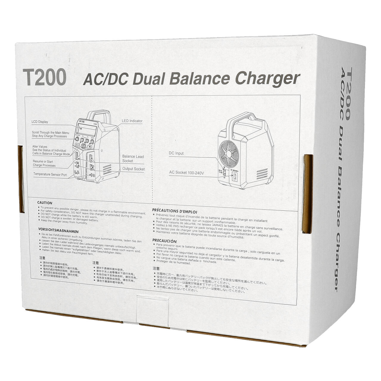 The SkyRC T200 is a universal AC/DC multi-function charger/discharger that can be used with the most popular battery types, such as LiPo/LiHV/Lilon/LiFe/NiCd/NiMH/Pb.